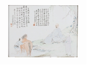 浅绛《浴马图》瓷板画,长42.5、宽34厘米。在柳阴花枝下,河塘岸边,静坐着一位精神矍铄、面目清瘦的老者,人物开相写实而古朴。浅水中站立的骏马,健壮而温顺。两名童子简笔勾勒,却生动而传神,一位童子手持水烟袋静心守候,另一辛勤劳作。画面删繁就简,主次分明,文人气息扑面而来。