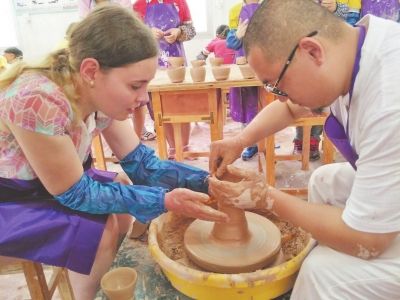 远道而来的外国友人在非遗传承人的指导下学习拉坯