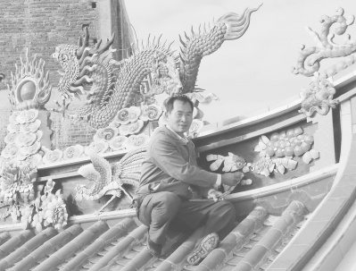 在东山县前楼镇岱南村新扩建的妈祖庙厝顶上,孙丽强又完成一项剪瓷雕佳作