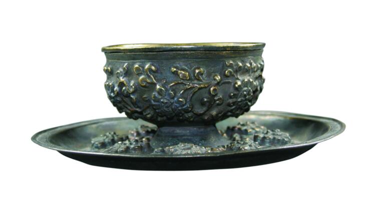 溧阳市博物馆所藏这套通体牡丹缠绕、颇具富贵雍容之气的银托盏,在当时也可算是一件高档次的酒具了。