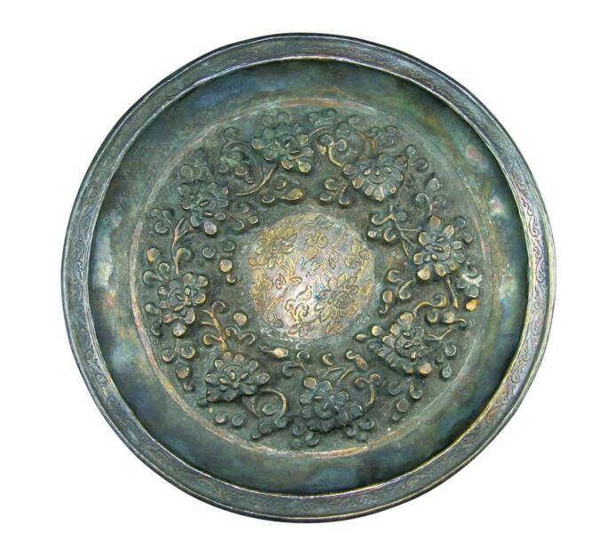 底部银托盘(图2),直径约17厘米,亦使用锤揲与錾刻工艺制成,盘心为一对平面阴线刻牡丹图案,周围锤凸出八朵高浮雕的缠枝牡丹环绕,盘口边沿为一圈细线刻装饰,银托盘整体纹饰造型风格与银盏一致。银托盏虽历经千年,其表面依稀留有当时鎏金的痕迹。