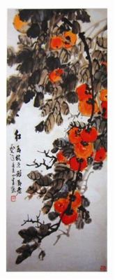图1,《红柿图》,纸本,彩绘。纵162、横45厘米。图绘两枝累累红柿,玛瑙般成串熟透的大柿子把枝头压弯,从上直到下方。在左侧中下方落款:“红在心头甜到老。一九五八年春月,星五画。”下钤红文印“星五”,右下角还钤一方白文收藏印。