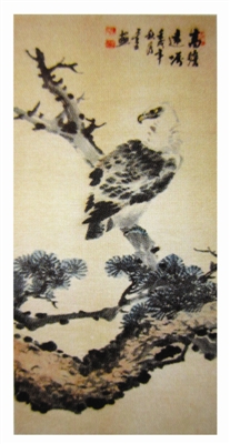 图2,《高瞻远瞩图》,纸本,淡彩。纵160、横46厘米。画一只苍鹰栖息在枯松枝上,作回头顾盼同伴飞来。右上方落款:“高瞻远瞩。壬戌年秋月,星五画。”下钤红文印“崔氏”“星五”。壬戌年,即民国十一年(1922)。