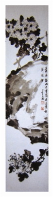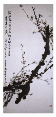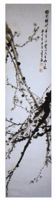 图3,《梅花独尊图》,纸本,墨笔。纵163、横42厘米。从左下角伸出一枝老干向右上角弯弓折左,不少嫩枝上梅花朵朵绽开。右上侧落款:“信知天下无双品,独占梅花第一尊。辛酉年夏月,星五时年七十有五。”下钤红文印“星五”。辛酉年,即1981年。