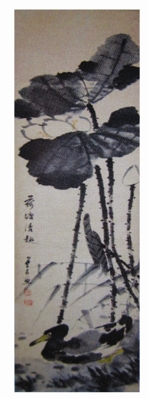 图4,《荷塘清和图》,纸本,墨笔。纵163、横39厘米。上方被三面田田的荷叶占满,一枝盛开的荷花躲在荷叶间,一枝花苞在右侧荷叶下;下方一只野鸭在荷塘畅游。左侧下方落款:“荷塘清和。星五画。”下钤红文印“崔氏”“星五”。