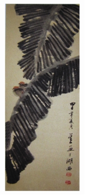 图5,《芭蕉图》,纸本,墨笔。纵162厘米,横39厘米。两片硕大的蕉叶几乎布满整个画面,具有很大的气势。右侧下方落款:“甲子年夏月,星五画于湖西。”下钤红文印“星五”、白文印“星五之印”。甲子年,即1984年;湖西,即指微山湖西的单县,解放战争期间曾设“湖西边区”,其治所在单县。