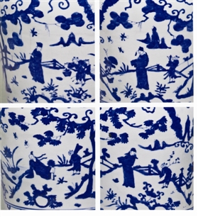 实际上,“四爱图”自元代以来就成为青花瓷上经常使用的题材。这里我们要介绍的这件明嘉靖青花带盖梅瓶(见图),即是如此。其高45.3、口径5.8、足径13.3厘米,小口、短颈、丰肩、敛腹、平底,带覆斗形盖。器盖带莲苞纹,盖面及盖壁分饰四杂宝及十字纹等;梅瓶器身分五段装饰,器肩青花横书“大明嘉靖年制”楷书一圈;其下六个如意云头开光内画折枝花卉纹,间饰银锭、艾叶等杂宝纹。腹部主要纹饰为四组山水人物画——“王羲之爱兰”“陶渊明爱菊”“周敦颐爱莲”“林和靖爱梅”等明贤高士隐逸故事,其间并绘有童子随伺,或携琴、或持壶、或折花。下腹及底边分别装饰五瓣花及变形莲瓣纹各一道,纹饰上下均以青线二道分隔。硕长形带盖梅瓶以及环肩书款形制,流行于明晚期嘉靖万历年间,梅瓶肩底之间微敛直下,弧线差距较小,颇具时代风格。