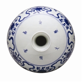 本品青花笔意简拙,青料匀浓带紫色调,但无深浅层次,反映出明晚期嘉靖回青色料的效果。回青料是进口石青颜料的一种,内含钴的金属氧化物。清代蓝浦在《景德镇陶录》中记载:“嗣有大珰镇云南,得外国回青,价倍黄金,知其可烧窑器,命用之……回青以重色为贵……色惟回青盛作,幽菁可爱,故嘉器青花亦着。”而嘉靖时江西布政使司王宗沐在《江西大志·陶书》中详细记载了回青来源及用法等内容,“陶用回青,本外国贡也……回青行,石子遂废……按验青法:回青淳则色散而不收,石青加多则色沈而不亮。每两加石青一钱,谓之上青,四六分谓之中青……中青用以设色,则笔路分明。上青用以混水,则颜身青亮。”