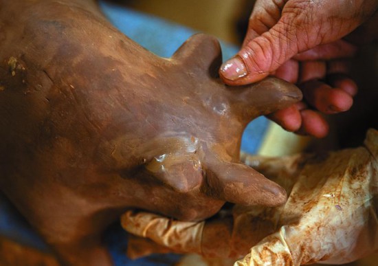 工作人员对泥塑进行抛光处理。一件泥塑需要经历13道工序才能制作完成。