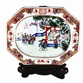 最近刚拍得一个长方八角粉彩人物故事大盘(41×33厘米)(见图),初看纹饰是清嘉庆年的外销瓷。盘边沿四周饰以锦地花卉如意纹,盘中绘制《唐明皇梨园调舞图》。