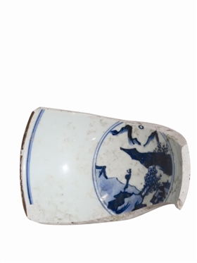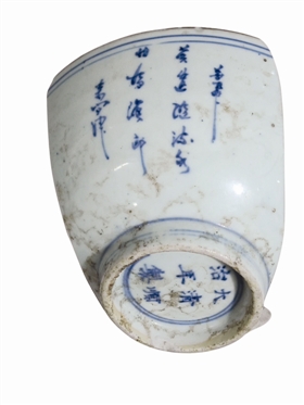本文所述这件清顺治年间的青花残器,有天、有地、有酱口、有诗、有画、有款、有暗刻纹,碗心绘有山水人物,碗外写有文字,诗书画皆有。从研究分析顺治青花的工艺特点的角度来看,这件藏品虽然已经残损,但仍不失为一件值得收藏的实物标本。