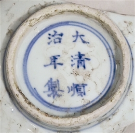 顺治瓷器写年款的官窑很少,主要是青花碗和茄皮紫釉盘,以书写“大清顺治年制”两行六字楷书青花款为主,也有写“顺治年制”四字款。款字用笔有力、起笔见峰、住笔见顿、划多下拉、勾捺上剔,但整体布局不甚规整。顺治官窑瓷器存世不多,极为珍贵,馆藏多为国家一级文物。