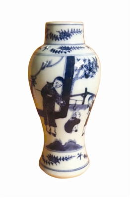 这只观音瓶,青花发色大部沉着,局部有点状飘浮,底部只划“双圈”,不记年款的也不少见,当然,主要是指民窑制品,而民窑制品,却是更多地配以民间故事的绘画,流传相对更广。
