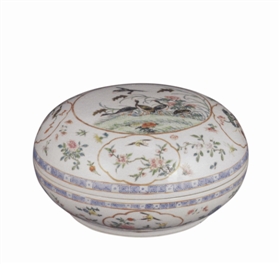 清代瓷器的釉装饰发展到了极致,以各种彩瓷为主,青花次之,大量使用色釉,其中彩瓷以粉彩为代表,到中晚期更是占据了主导地位。这件捧盒器身上的图案繁复而又清新疏朗,刻意打破岁时的传统,将暮春的牡丹和盛夏的荷花等一并呈现,主题鲜明,极具装饰效果。芦苇象征禄位,牡丹象征富贵荣华,菊花象征长寿,莲花象征高洁,各个纹饰都洋溢着浓厚的吉祥寓意,组合在一起,就呈现出一缕瑞祥宁和的气息。整件器物器型硕大端整,绘工精细入微,粉彩呈色艳丽匀润,纹饰恬淡雅致,集实用性和工艺美术性于一体,显示出清代粉彩瓷制作工艺的成熟与精湛。