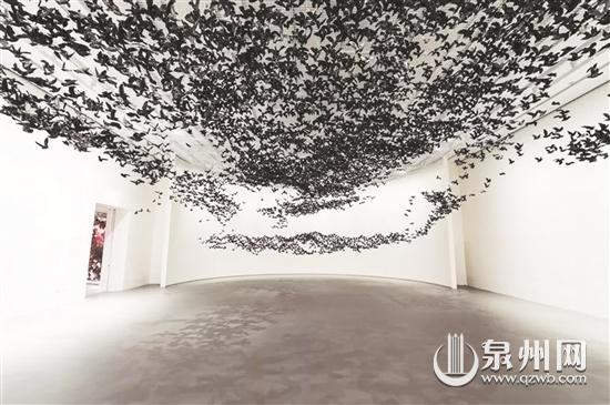 展览现场,万只“瓷鸟”如魂似影,贯穿展览始终。这些不同形态的陶瓷椋鸟,在材料上呼应陶俑, 是蔡国强邀请家乡工匠,经过一年研究手工制成,在运往墨尔本后,在一次大爆炸中染出浓淡各异的水墨画般表情。