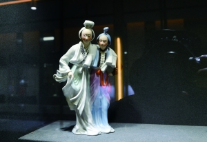 《智取威虎山》《江姐》《白毛女》……一系列极富年代感的戏剧作品,也反映在同时代的陶瓷艺术创作上。“上世纪60年代初,出了一部歌剧《江姐》,这个雕塑瓷的造型,依据的就是歌剧的造型:江姐站在岩石上,后面是青松,象征着女英雄江姐坚贞不屈的革命精神。”景德镇十大瓷厂陶瓷博物馆藏友会会员吴华锋是收藏雕塑瓷的行家,现场展出的16件(组)人物雕塑瓷,都是来自他的收藏。现场,还有来自传统戏曲的雕塑瓷作品,比如白娘子和小青、宝玉和黛玉、崔莺莺和张生……