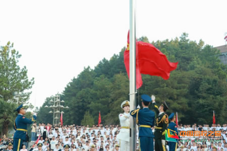 在雄壮激昂的国歌声中,景德镇陶瓷大学国旗护卫队迈着铿锵有力的步伐护送国旗进场。鲜艳的五星红旗徐徐升起,全场师生怀着崇敬和激昂的心情,行注目礼,高唱国歌。