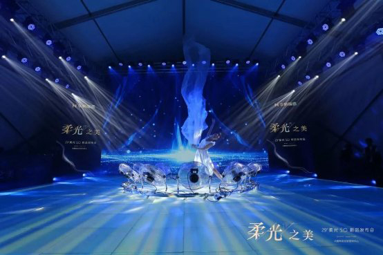区别于以往传统的发布会,本次华鹏陶瓷新品发布会采用全感官沉浸式光影设计。现场搭建成高8米,占地500平米的剧场。从剧场式光影长廊步入,开启一段光的旅行。内场L型互动屏幕,营造全沉浸式体验,光影穿梭,置身其中,仿佛穿越到另一个世界。舞蹈视频互动秀,以情景舞蹈的形式,通过【聚变】、【寻觅】、【缔造】、【突破】四幕,演绎陶瓷从无到有,华鹏陶瓷柔光砖5.0由此而生的过程。