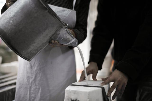 11月12日,在福建德化明华陶瓷艺术研究所,陈明华(左)和儿子张国晖在向模具灌浆,凝固成型后就可以进行烧制。