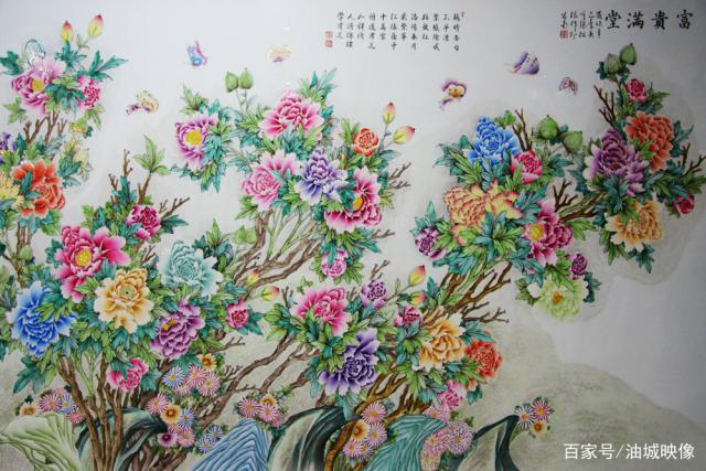 整面墙都是陶瓷烧制,最惊诧眼神的是景德镇工匠将富贵的牡丹图,也烧制在正面陶瓷墙上,这个艺术水准让人叹为观止。