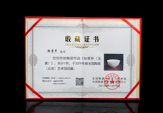 《如意杯(玉黄)》于2019年被全国陶瓷(北京)艺术馆收藏