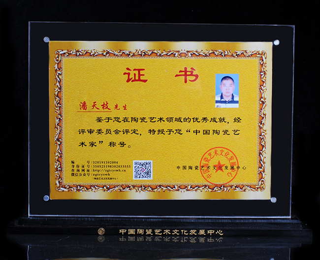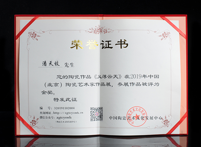 潘天枝从事陶瓷雕塑10多年,主要作品有观音、弥勒、历史人物,茶器等。作品多次获得国内各评比大赛金奖,2019年获评“中国陶瓷艺术家”,作品《义薄云天》荣获2019年中国国际(北 京)陶瓷艺术名家精品展作品评比金奖等,其作品深受收藏家及有识之士青睐,广受好评。