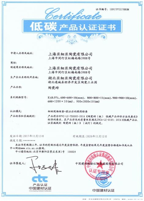 2012年,由财政部、住房和城乡建设部下发的《关于加快推动我国绿色建筑发展的实施意见》中提出,到2020年,绿色建筑占新建建筑的比重将会超过30%,以**限度节约资源,保护环境,为人民提供健康、适用、高效的使用**。亚细亚瓷砖,作为持续关注健康人居家装的企业,坚持践行环保重任,走企业可持续发展之路。一路走来,揽获国 家 级绿色工厂证书、能源管理体系认证、中国环保产品认证证书、建材环保产品认证证书、绿色建筑选用产品证书、绿色陶瓷砖等十多项绿色建材领域的专业权威认证及荣誉,走在中国陶瓷行业环保水平的最前列。
