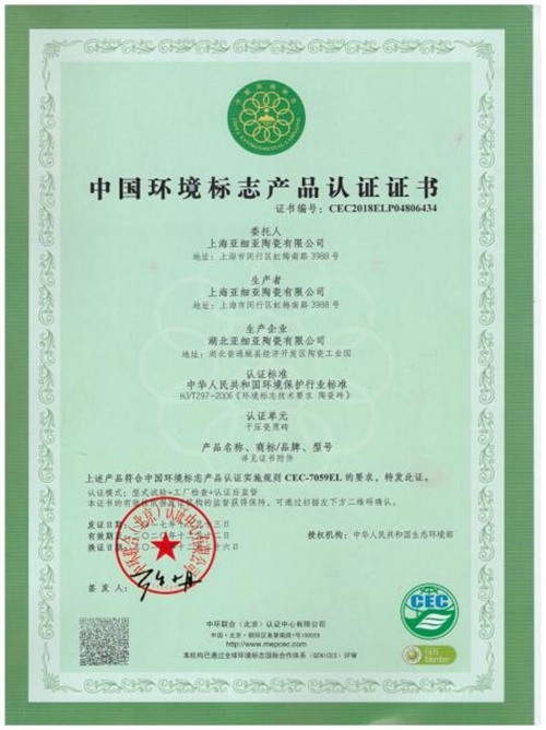 中国环境标志,是目前国内市场公认的绿色环保产品证书,因其环保要求相当高,也被称为国内最难通过的环保证书。中国环境标志已与澳大利亚、韩国、日本、新西兰、德国、泰国、北欧等国家环境标志机构签署了互认合作和代理协议,实现国际互认。荣获此誉也彰显了亚细亚瓷砖在中国乃至全球绿色制造的领 先地位。
