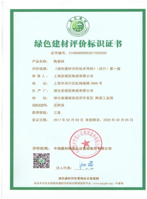 三**绿色建材标识为绿色建材的**等级,素以审核条件严苛、环保排放要求高著称,亚细亚瓷砖荣获最 高 级别三**绿色建材评价标识,可见其在环保领域的投入与领 先。