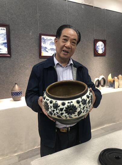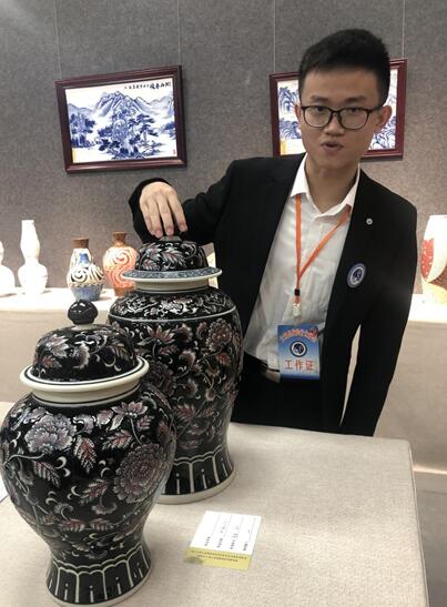 发源陶瓷有限公司总经理邓诗优告诉记者,“我手持的作品是仿古的蓝彩,是去北京和广西时,在博物馆获取的灵感。发源陶瓷此次参展带来了二十件展品,共十四组,有仿古、蓝彩的,也有釉面的,造型有聚宝缸和壶等。”