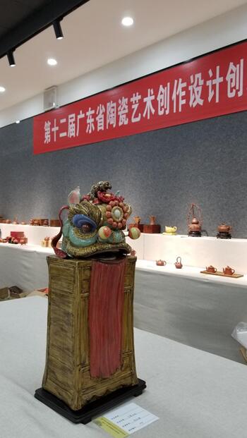 广东省陶瓷艺术大师、佛山市工艺美术学会副会长兼秘书长周永锵此次从佛山带来了十多位作者的30件陶塑作品,作者涵盖多名中国陶艺大师和省级大师,包含有人物、动物等多个类别,每件都是作者今年创新作品,也代表了当地陶塑工艺人文精神和现今石湾陶艺发展的方向。其中这樽狮头陶器是周永锵的作品,作品顶部以南方扎作狮头作为题材,下方以传统傢俬百子柜作衬托,狮头目光炯炯有神,长须下飘,静中有动,不怒而威。(邹锡兰 梁嘉慧)