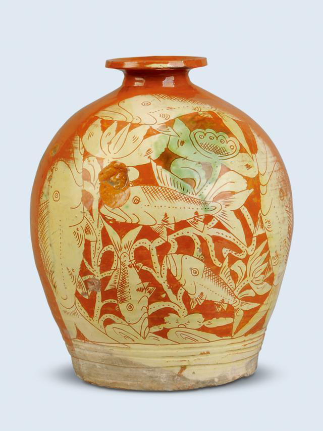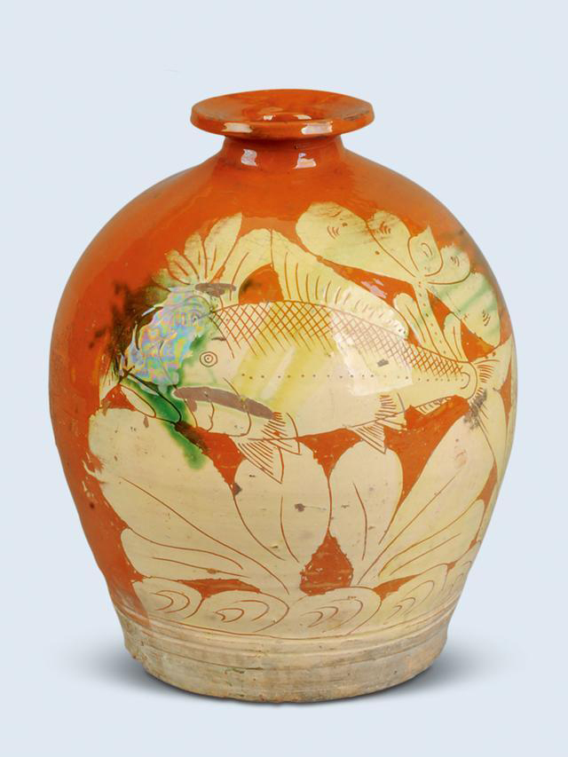 界首窑位于安徽省西北部的界首市,主要生产彩釉陶器,清代民国时期的界首窑彩陶在安徽及周边省份很有影响力,鱼纹也是其常见的纹样之一。这件清代界首窑彩陶鱼纹小口罐(图6),高30.2、口径9.5、底径17.2厘米,安徽博物院藏。撇口,平唇,短直颈,溜肩,弧腹,平底,底部露胎,显砖红色陶胎。罐身一面剔刻一条大鲤鱼穿梭于莲花、荷叶之中,另一面剔刻大、小六条鲤鱼嬉戏在莲池中,莲和鱼的组合是传统吉祥纹样,谐音为“年年有余”。界首彩陶的基本工艺一般是在胎体上施一层酱红色化妆土和一层白色化妆土,之后进行剔花工艺创作,剔除上层白色化妆土的部位就露出酱红色化妆土的地子,从而形成“酱地白花”的剔花纹样,再入窑素烧,取出后再施绿彩,再罩上一层透明釉,之后第二次入窑烧造,最终形成酱红、白、绿三色彩,这种色彩丰富的装饰效果符合民间百姓的通俗审美。