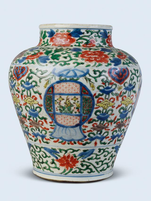 图4 清康熙 景德镇窑青花五彩鱼龙纹罐