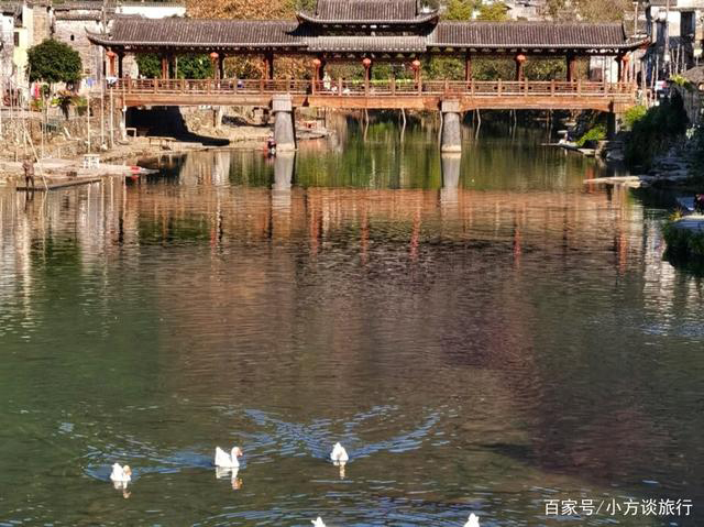 这座小镇真可谓依山傍水,就坐落于山水之间。清一色的建筑风格看上去十分清爽,让人眼前一亮。一栋栋阁楼在河的两岸建起,将两岸联通的是一座又一座的古桥,坚定地屹立在水的中央。河水清澈见底,有镇上的居民来此捣衣,也有鸭群在此嬉戏,偶有一老伯撑着一只小舟在湖中前行,一切是那样的祥和与安逸。