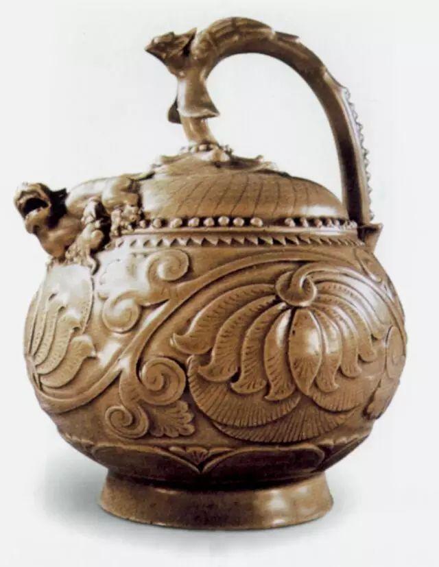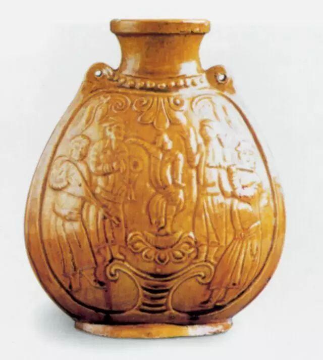 胡腾舞黄釉扁壶 高20.5厘米 北齐经过隋唐长达三百余年的统一,使中国古代文化形成了自己独有的特色。此时的酒文化也得到了长足的发展,并形成了以瓷酒器为主、金银酒器为辅的新的历史时期。