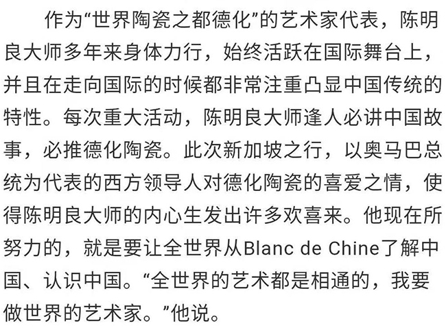 中国工艺美术大师、中国陶瓷艺术大师、国家非遗“德化瓷烧制技艺”代表性传承人陈明良作为艺术界的杰出代表受邀出席了本次峰会,并上台做了主题发言。