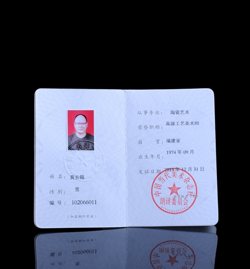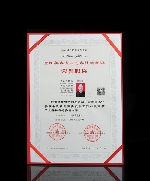 近日,陶瓷艺术家黄长锦,通过了中国当代美术专业艺术测评委员会评测,荣获“高级工艺美术师”。