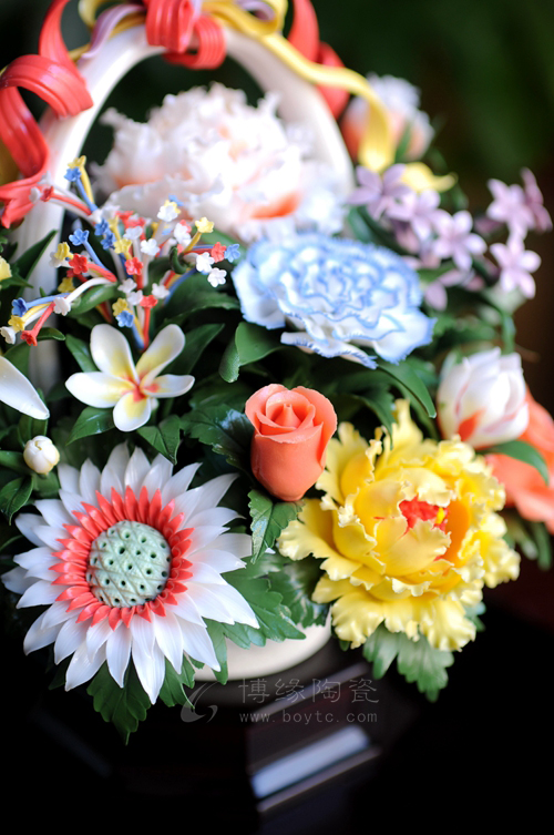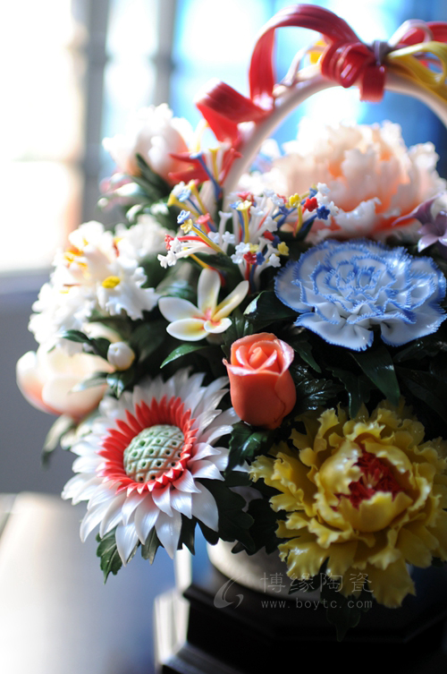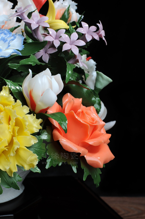 作品沿用德化传统的制瓷技法“捏、塑、雕、镂、贴、接、推、修,作品集合牡丹、玫瑰、菊花等尽显出百花争艳的姿态,呈现出花开富贵的一番景象,瓷花纯手工捏制,细腻精致、以假乱真。体现出创作者匠心独具。