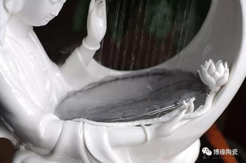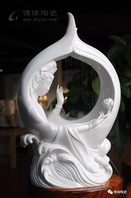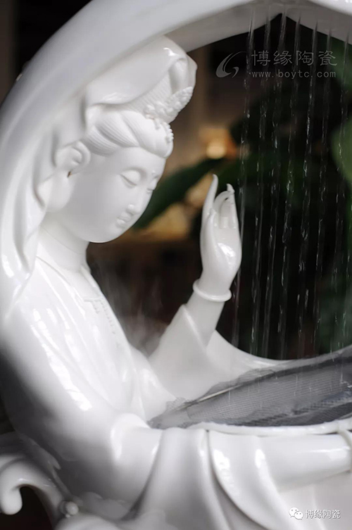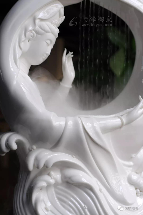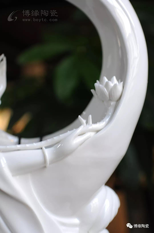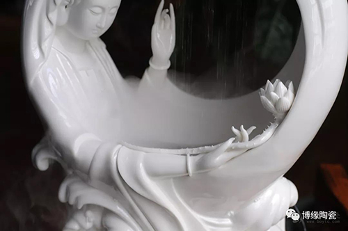 《莲花观音》以徳化白瓷为胎貭,圜劭有カ如凝脂似玉,观音衣服的皱褶刻画得犹如飘动的感觉,表现极具细腻完美,中间凹槽设计加湿功能,烟雾缭绕,犹如仙境,再现了高超的工艺和匠心独具的艺术构思,使作品具有非凡的神韵,充分体现了观音济世之神的神采,更体现出极富浓郁的东方文化底蕴和深邃的宗教文化。作品銭条清晰、筒浩、瀟洒,多変化,柔媚流暢,翻装自然,神情嫻雅平静,安洋自若,双目低垂凝思。面部刻刻細膩,衣紋則深而洗蘇,主次分明。