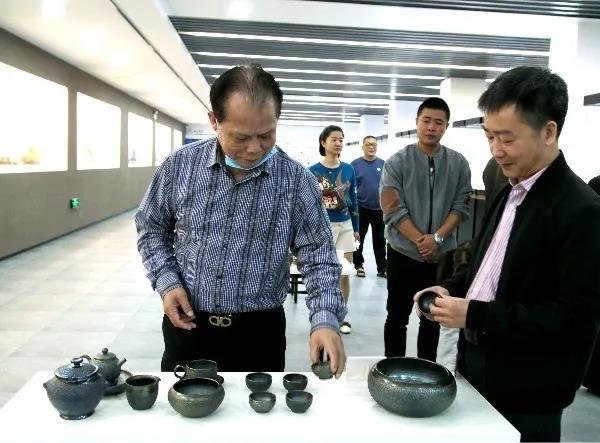 观展过程中,陈建新会长充分肯定了本次柴烧作品展的举办,并细细观看了每一组参展作品,认真了解了德化当前柴烧陶瓷的发展情况,同时,还时不时与县政府副处级干部徐文福、陶艺协会会长孙义渊、参展创作者刘川等,就柴烧作品工艺、柴烧艺术发展的话题展开了交流。