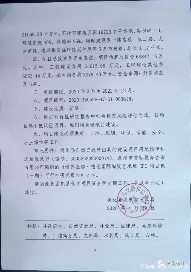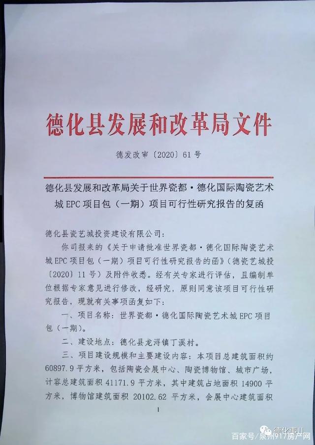 4月29日,德化县政府官网信息公开栏发布了《德化县瓷艺城投资建设有限公司关于德化国际陶瓷艺术城EPC项目包(一期)项目可行性研究报告的复函》(以下简称《复函》),文号为“德发改审〔2020〕61号”。