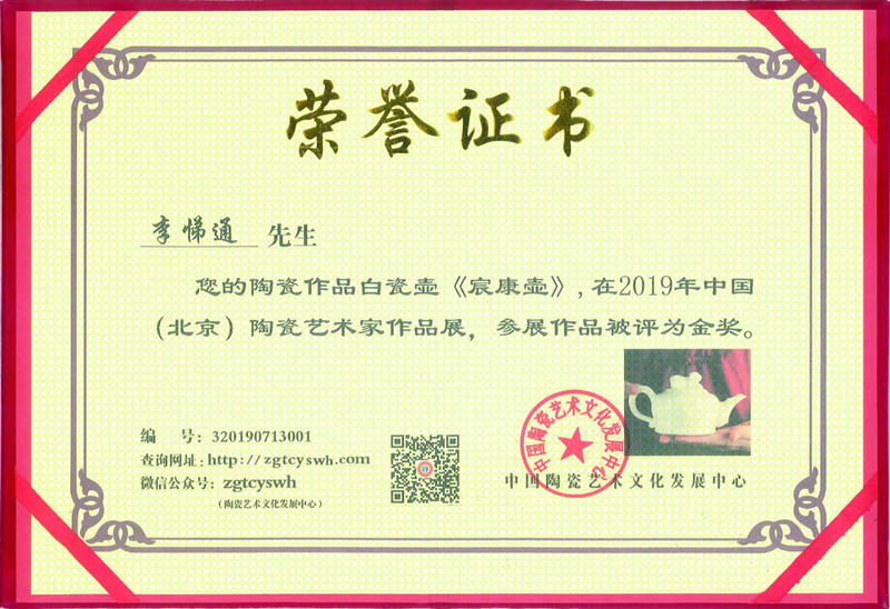2019年,陶瓷作品《宸康壶》荣获中国(北京)陶瓷艺术家作品展金奖;