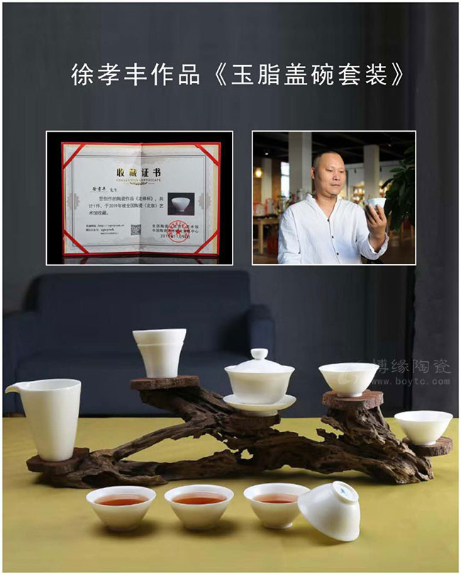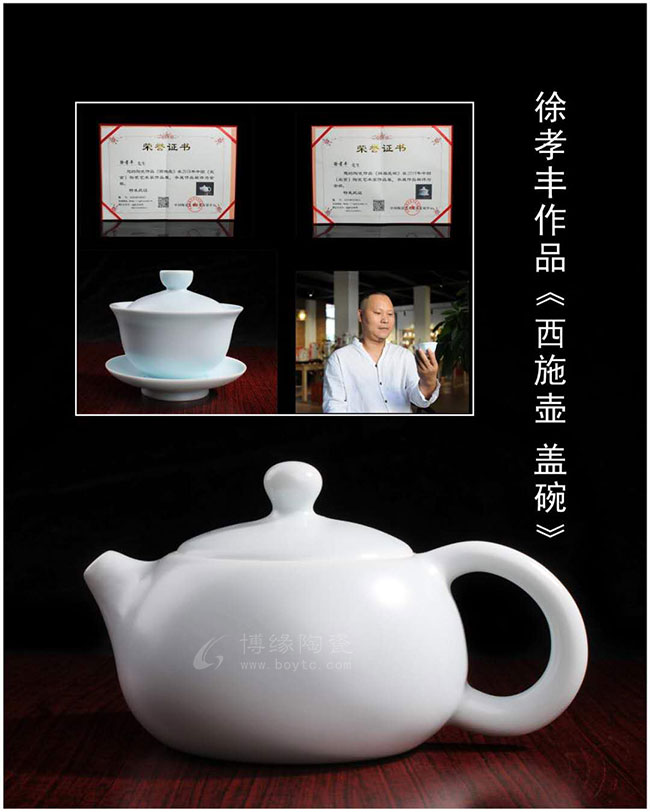 徐孝丰多件作品获国内外金奖,《乐禅杯》、《吉祥杯(玉黄)》、《西施壶》荣获2018年中国(北京)陶瓷艺术家作品展金奖。《祥福盖碗》等三件作品获2019年中国(北京)陶瓷艺术家作品展金奖《如意盖碗》获2020年中国(北京)陶瓷艺术作品展金奖等。