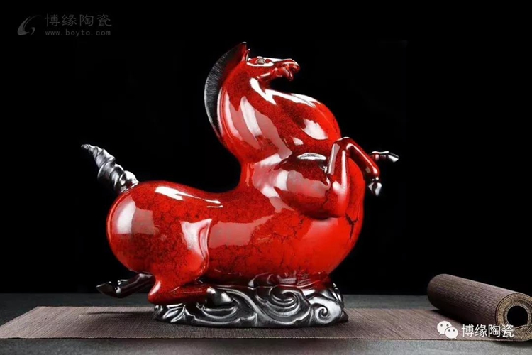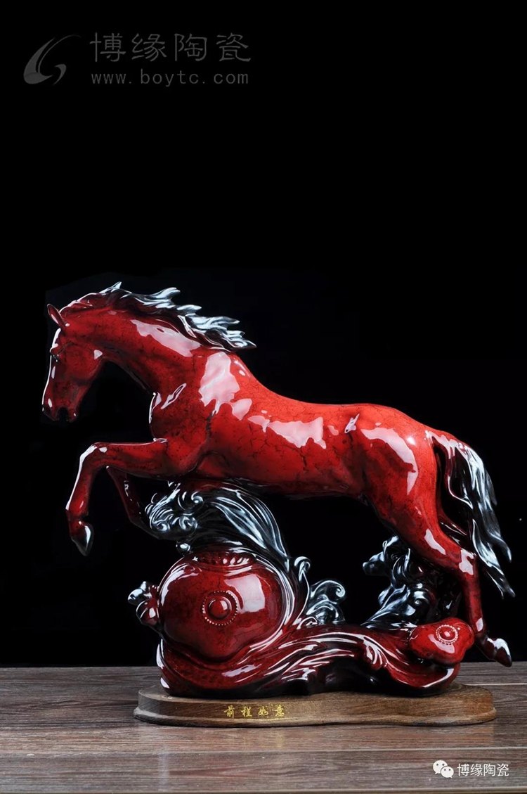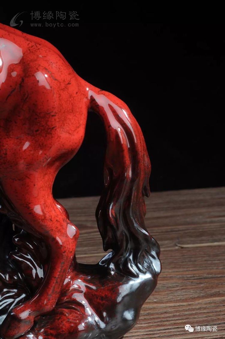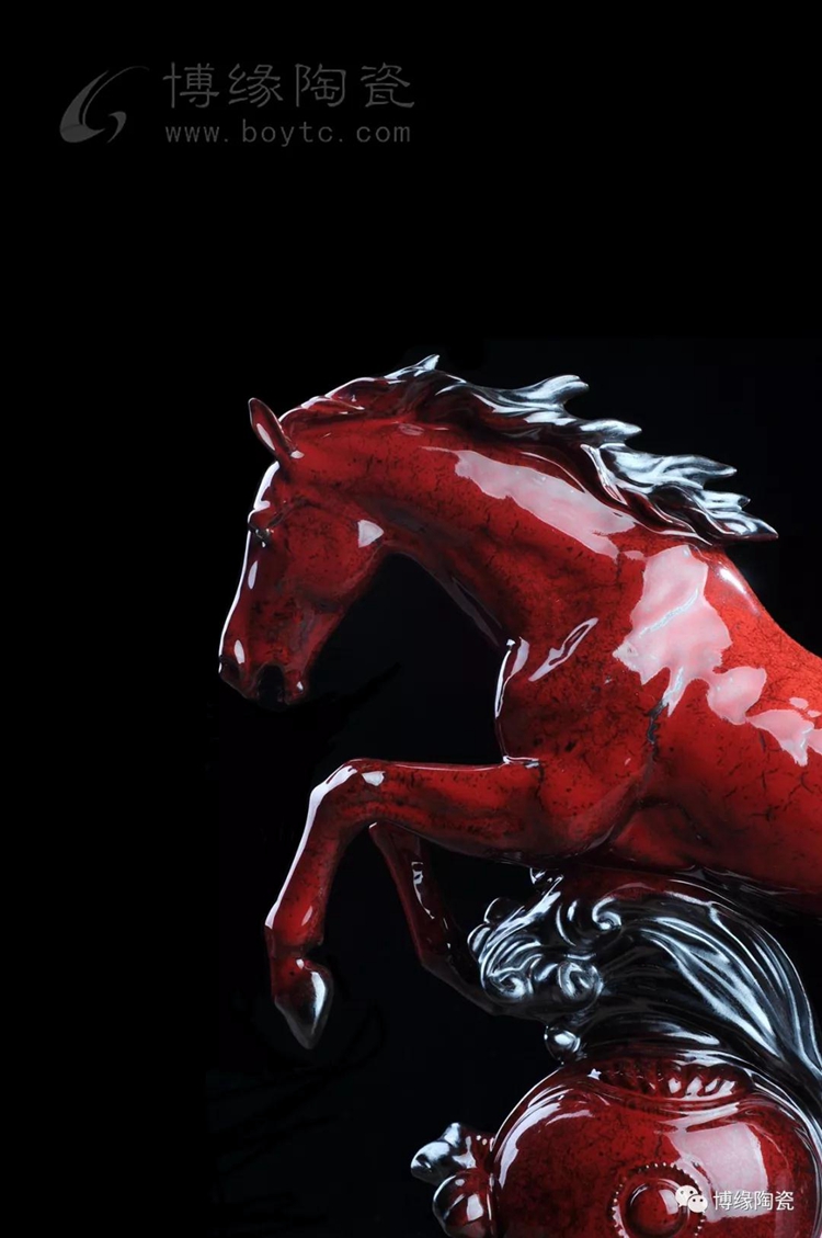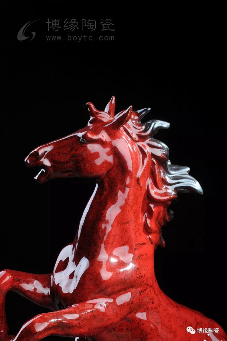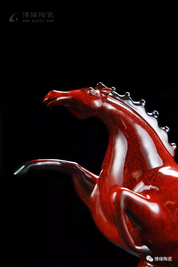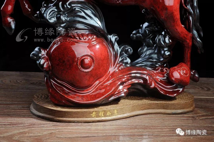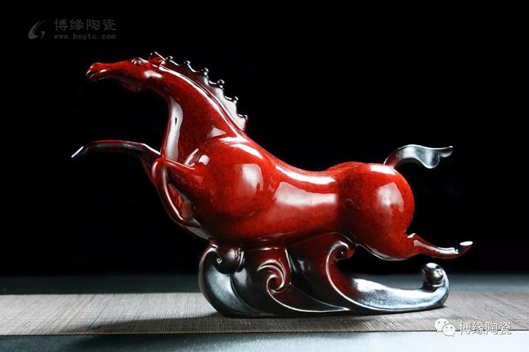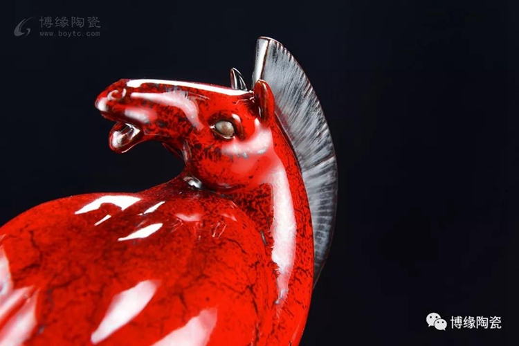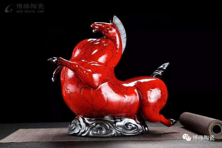 《前程如意》、《唐马》、《立马成功》、《马踏飞燕》、《踏浪天马》作品采用烈焰红釉经1300多度高温烧制,产生窑变效果,釉面鲜艳、喜庆。所塑骏马精神抖擞,身强力壮,有的两只前蹄腾空跃起,威风凛凛,鬃毛随风摆动,极富动感。在皮肤下面, 是热血奔涌的血管,进而是块状的肌肉与健壮的骨架,马的蹄、鬓毛、眼神、耳朵、乃至鼻息,都传递出 浓烈的信息,具有很强的艺术感染力。