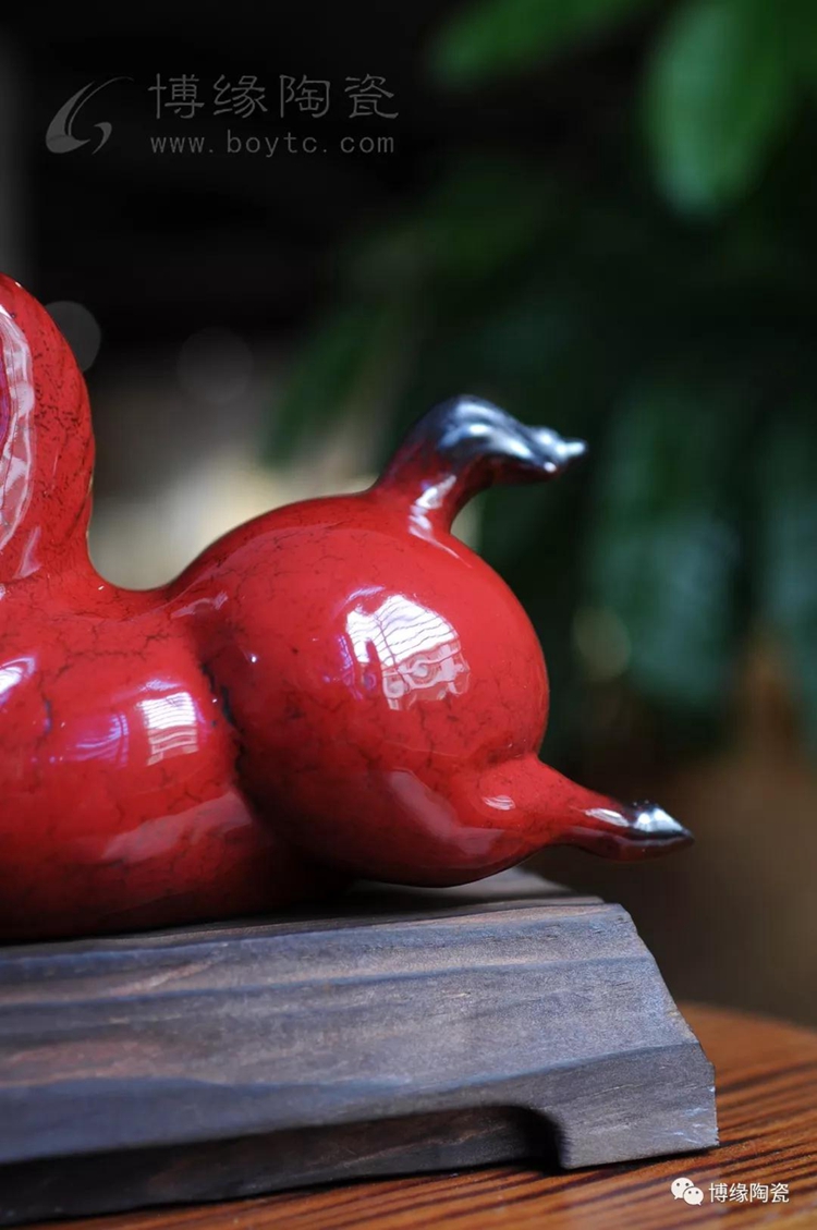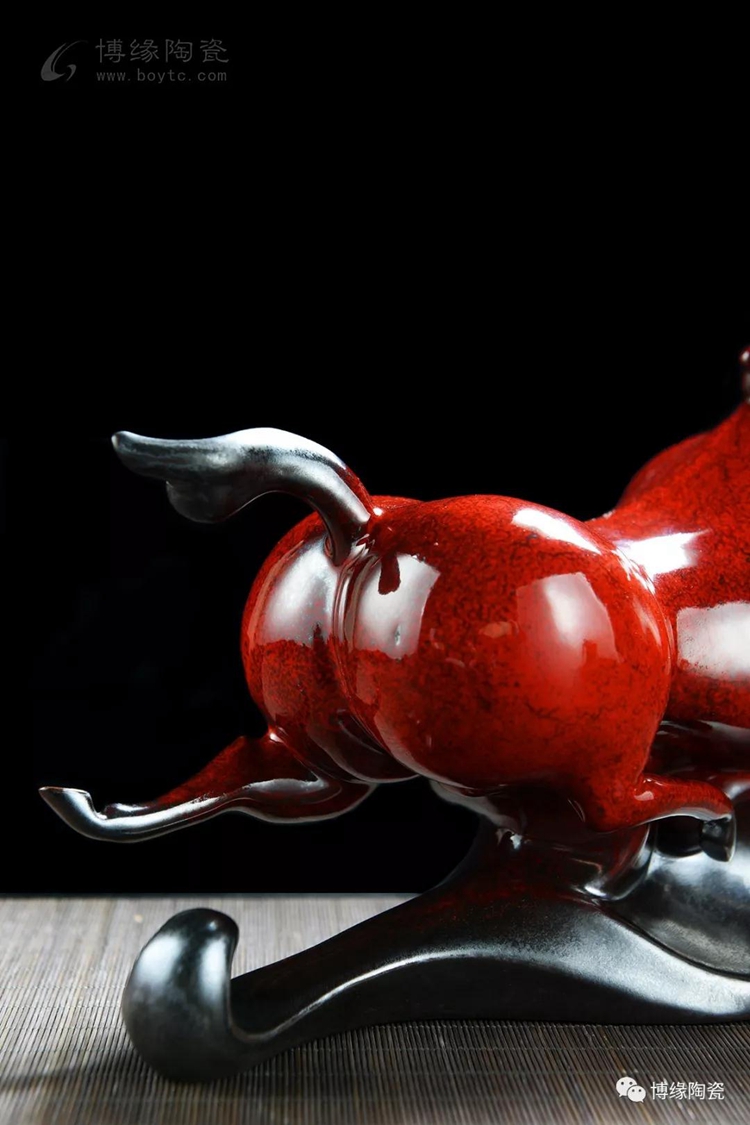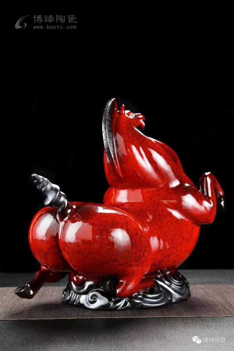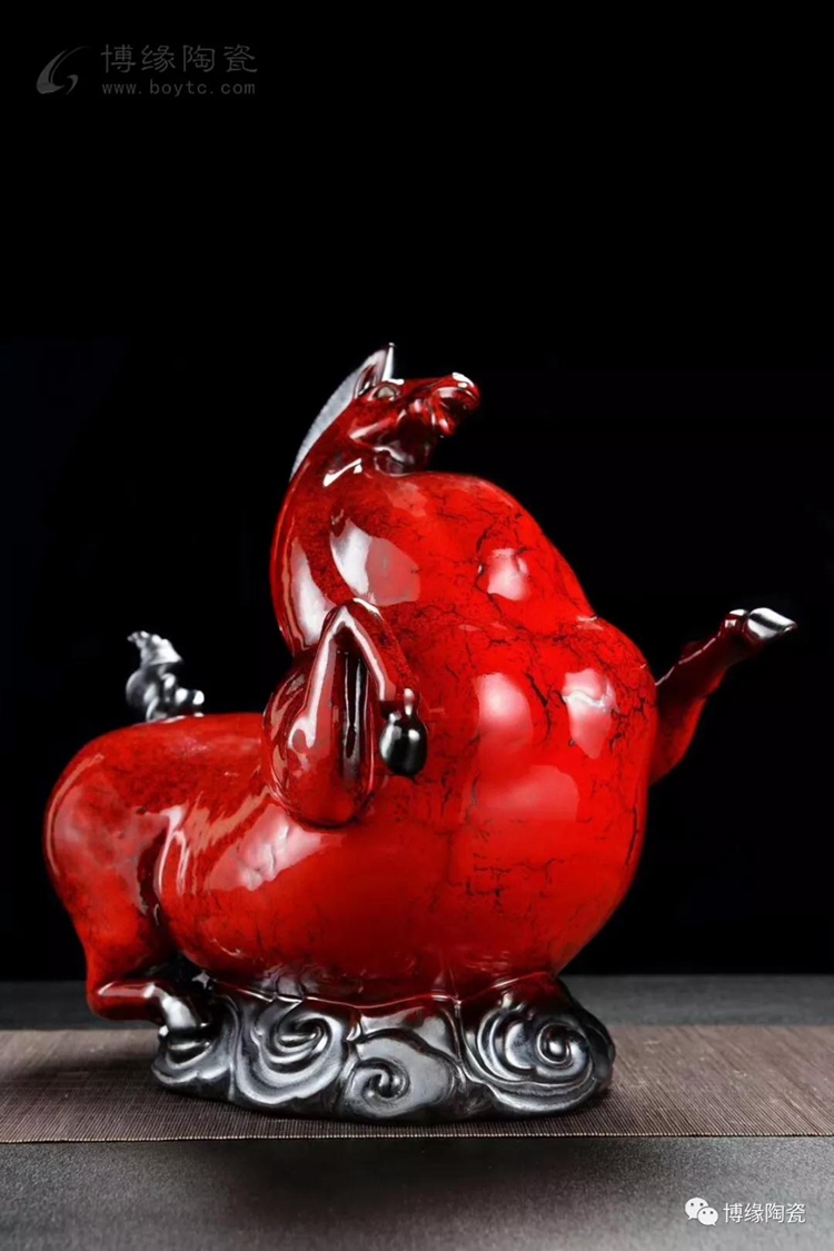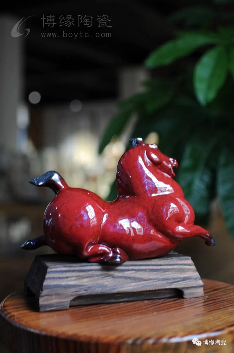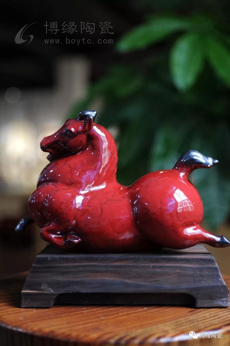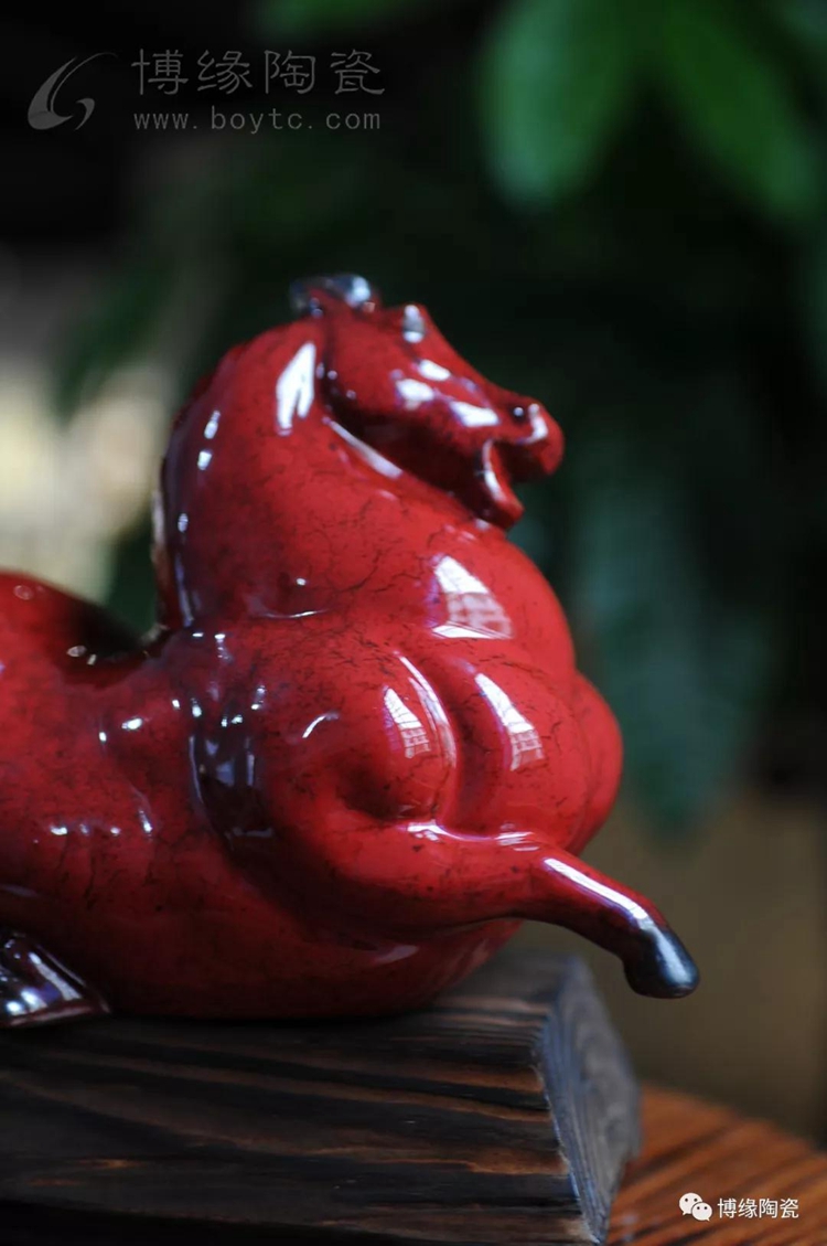 《前程如意》、《唐马》、《立马成功》、《马踏飞燕》、《踏浪天马》作品采用烈焰红釉经1300多度高温烧制,产生窑变效果,釉面鲜艳、喜庆。所塑骏马精神抖擞,身强力壮,有的两只前蹄腾空跃起,威风凛凛,鬃毛随风摆动,极富动感。在皮肤下面, 是热血奔涌的血管,进而是块状的肌肉与健壮的骨架,马的蹄、鬓毛、眼神、耳朵、乃至鼻息,都传递出 浓烈的信息,具有很强的艺术感染力。