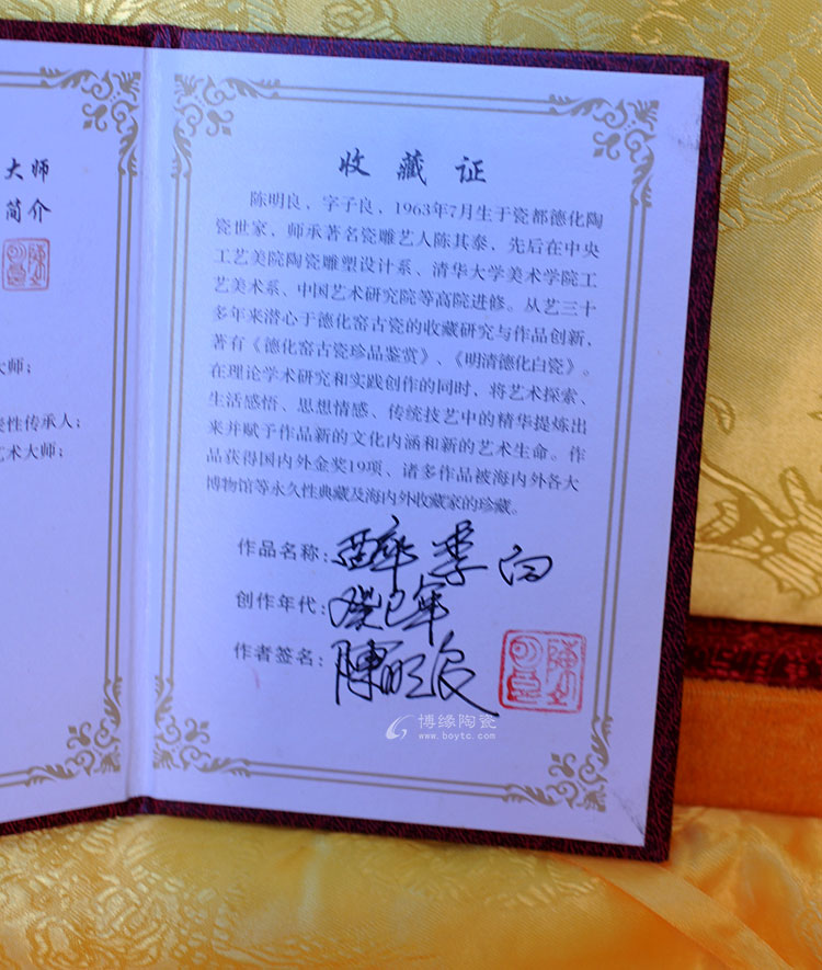 陈明良,1963年7月出生于瓷都德化陶瓷世家,师从中国著名民间瓷塑艺人陈其泰,1987年创办“凤池瓷雕厂”,先后在“中央工艺美术学院陶瓷雕塑设计系”;“清华大学美术学院工艺美术系”;“中国艺术研究院”等进修。陈明良是德化古陶瓷收藏领军人,连续几次荣登央视一、二、三套《寻宝》、《一槌定音》等栏目。2015年创办“瓷艺堂”德化窑古瓷珍藏馆,且对外开放,让更多人们参观鉴学。目前由泉州市人民政府授匾“优秀工艺美术大师工作室” ,同时也是泉州市德化瓷烧制技艺传习所重要基地。从艺近四十年来潜心于收藏德化窑古瓷研究与艺术创作,并编著《德化窑古瓷珍品鉴赏》、《明清德化白瓷》书。在理论学术研究和实践创作的同时,将艺术探索、生活感悟、思想情感、传统技艺中的精华提炼出来并赋予作品新的文化内涵和新的艺术生命。陈明良不但在传统人物雕塑做得出神入化而且日用器皿设计创作造型规整、材质与形态美结合,相得益彰。