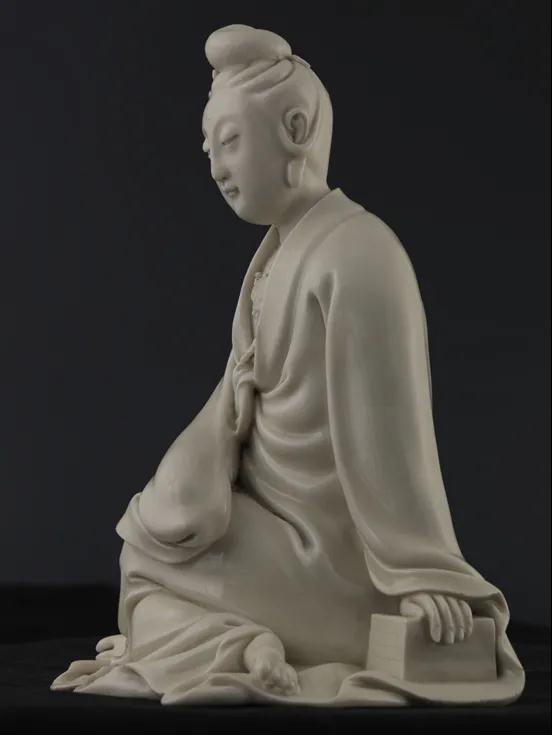 神态鲜活,质如凝脂。左臂下垂手扶一卷经,右手置于左膝上,双膝交叉,呈交腿坐态,跷足。
