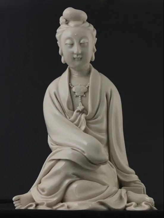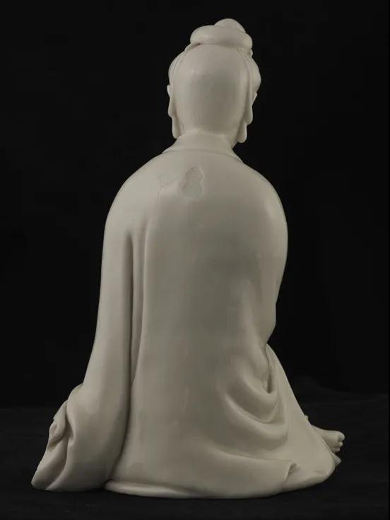 观音舒坐 神态肃穆。何朝宗款的白釉观音,高20.9厘米、底宽15厘米,通体白釉,观音舒坐,发髻高耸,眼帘下垂,身着羊肠裙。神态肃穆,衣纹简练洒脱。