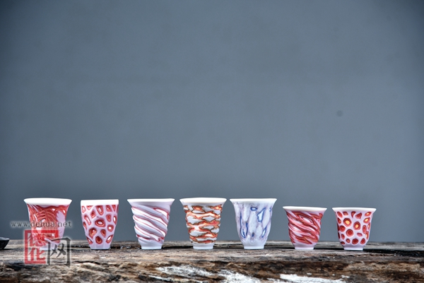 与传统绞胎工艺不同的是,徐华文的玉瓷绞胎杯不是将色泥拧在一起,制成新的泥料,然后拉坯成型,或切成片状作镶嵌使用,而是别具匠心的将色泥一层层的叠加到茶杯的坯体上,然后再经过图案雕刻,让颜色一层层的显露出来,新颖别致,极富艺术创新价值。