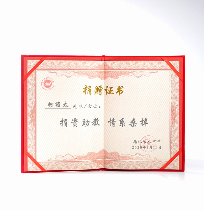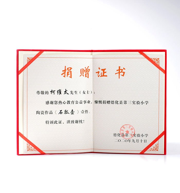 由德化县教育局杨光照副局长为中国青年陶瓷艺术家柯维太颁发《捐赠证书》。